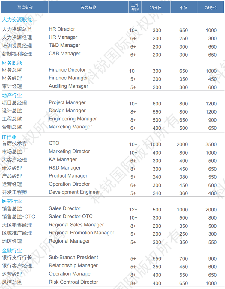 数据来源:猎头公司4008云顶国际 国际薪酬报告中资深行业专家对2021年热门职位薪酬范围及跳槽涨幅的预测。薪酬为基本年薪。